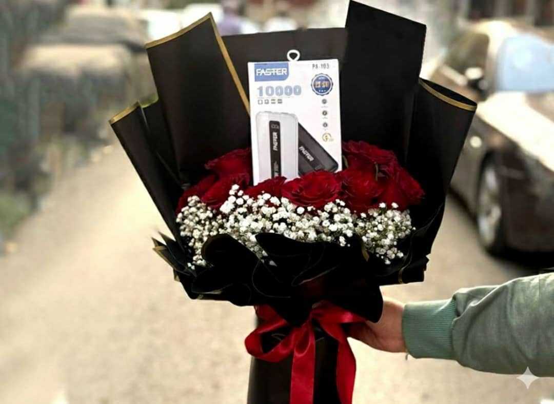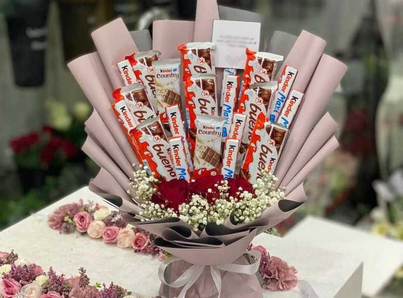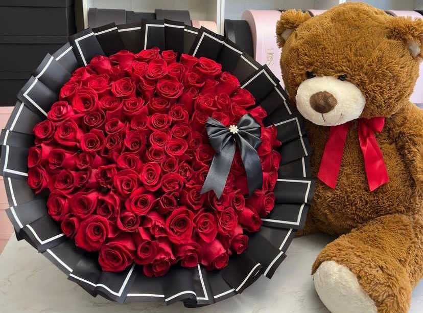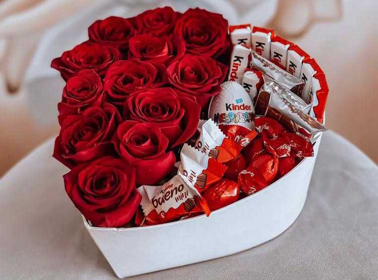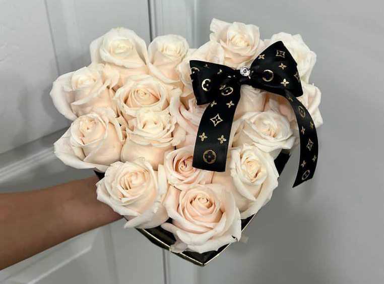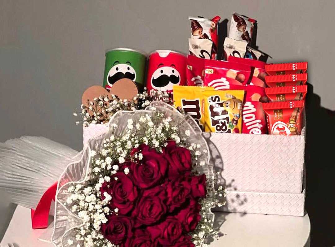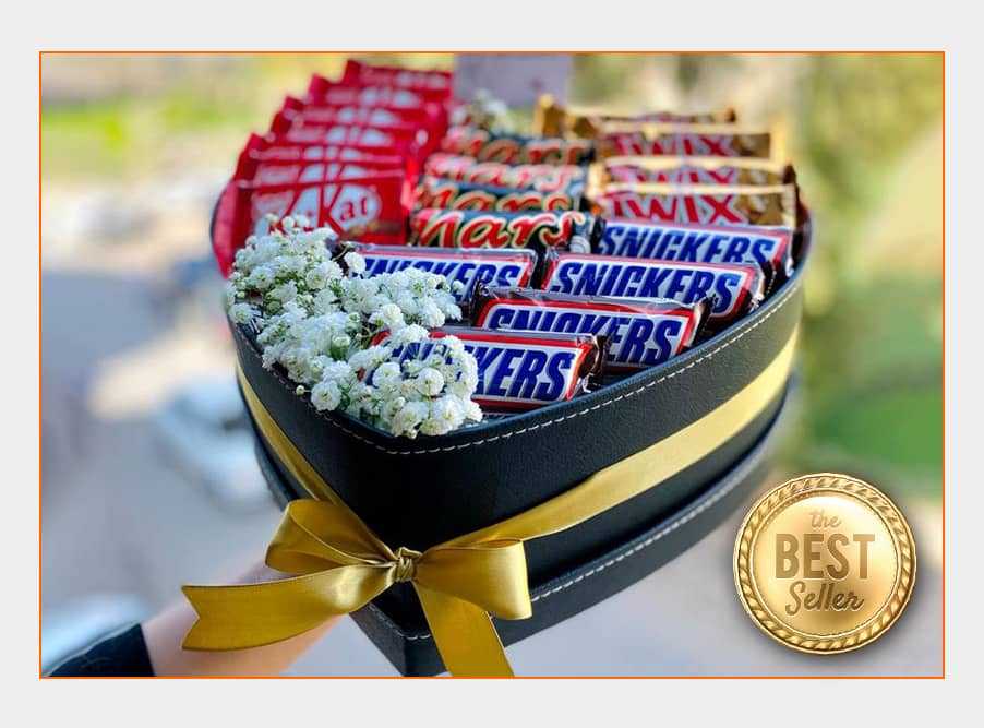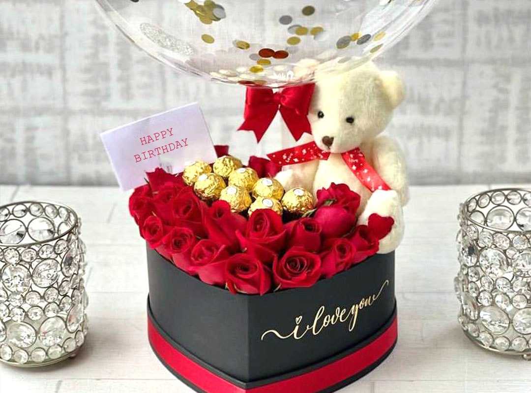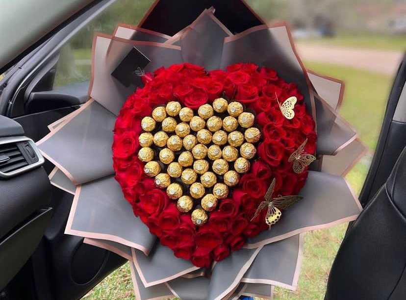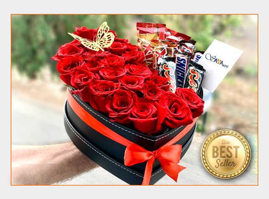 بوكس جلد اسود ( شكل قلب ) ورد جوري أحمر (25) شوكولا منوعة (10 قطع )