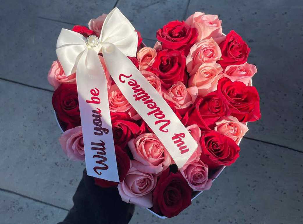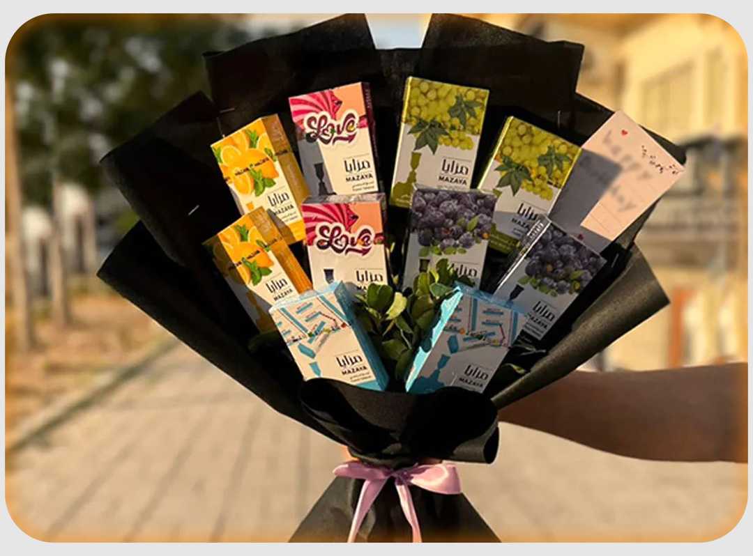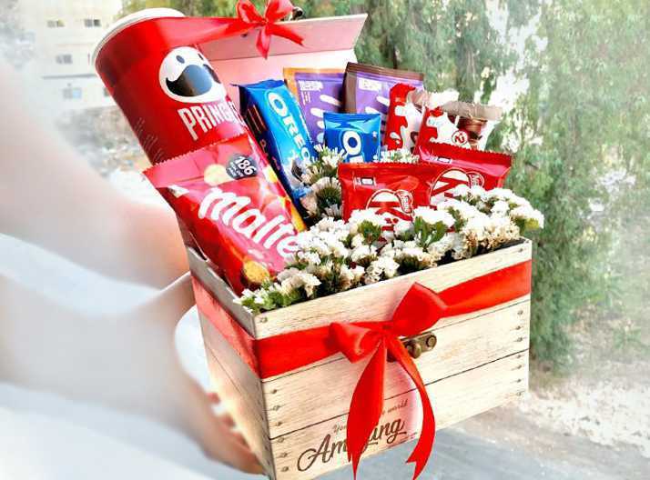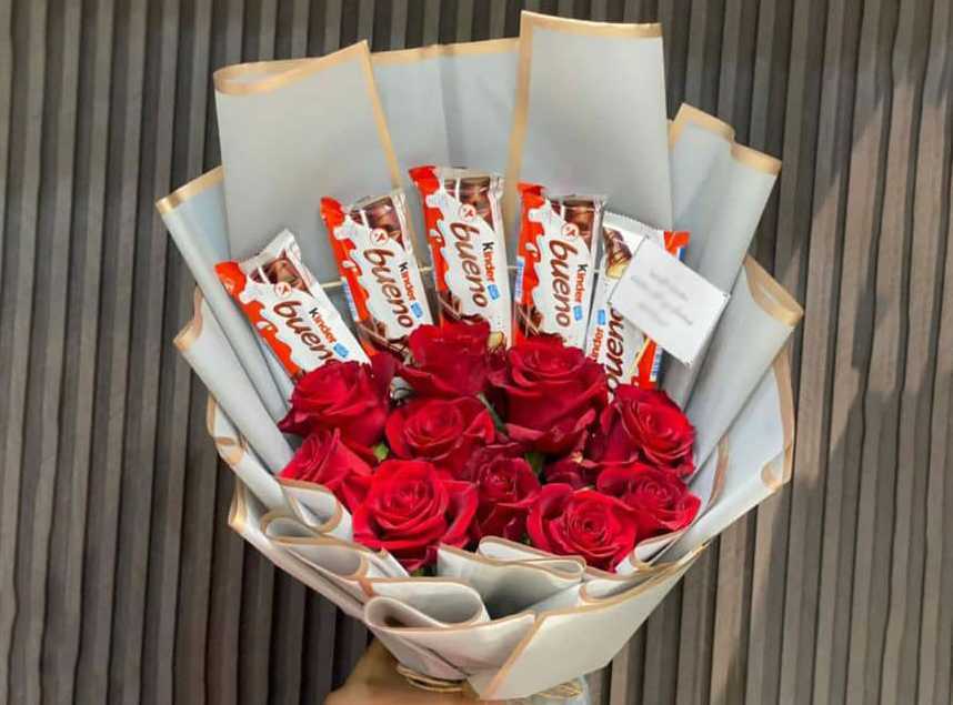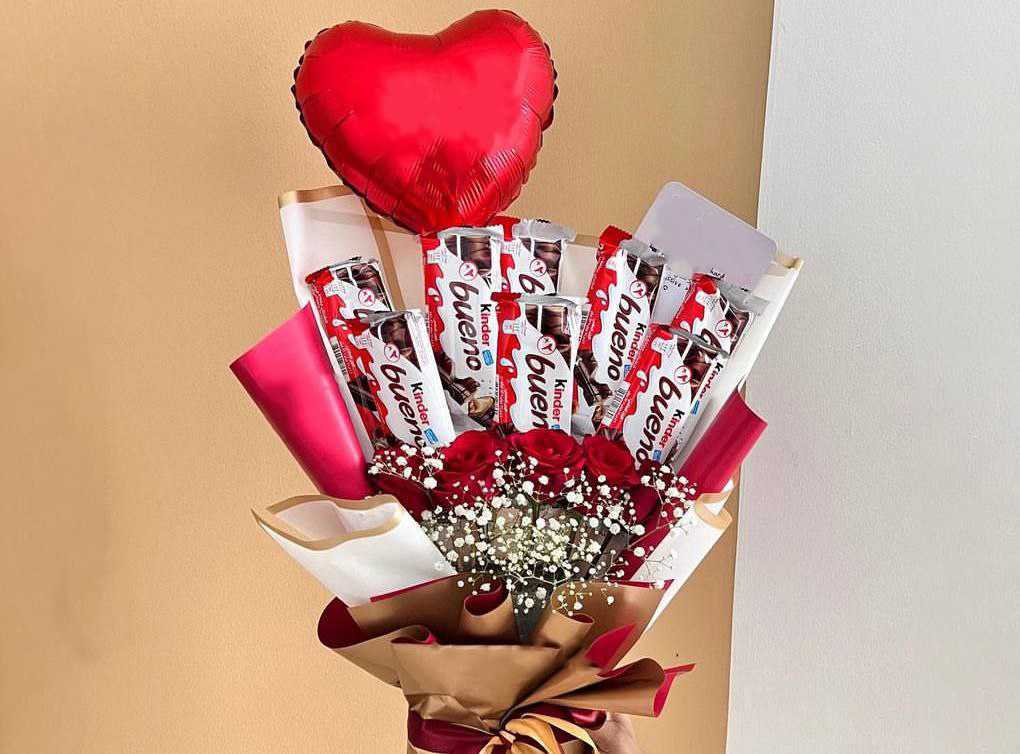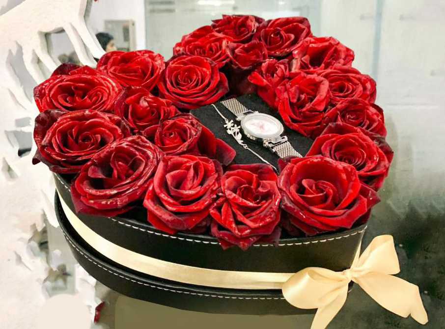 بوكس جلد اسود ( شكل قلب ) ورد جوري أحمر (25) شوكولا منوعة (10 قطع )